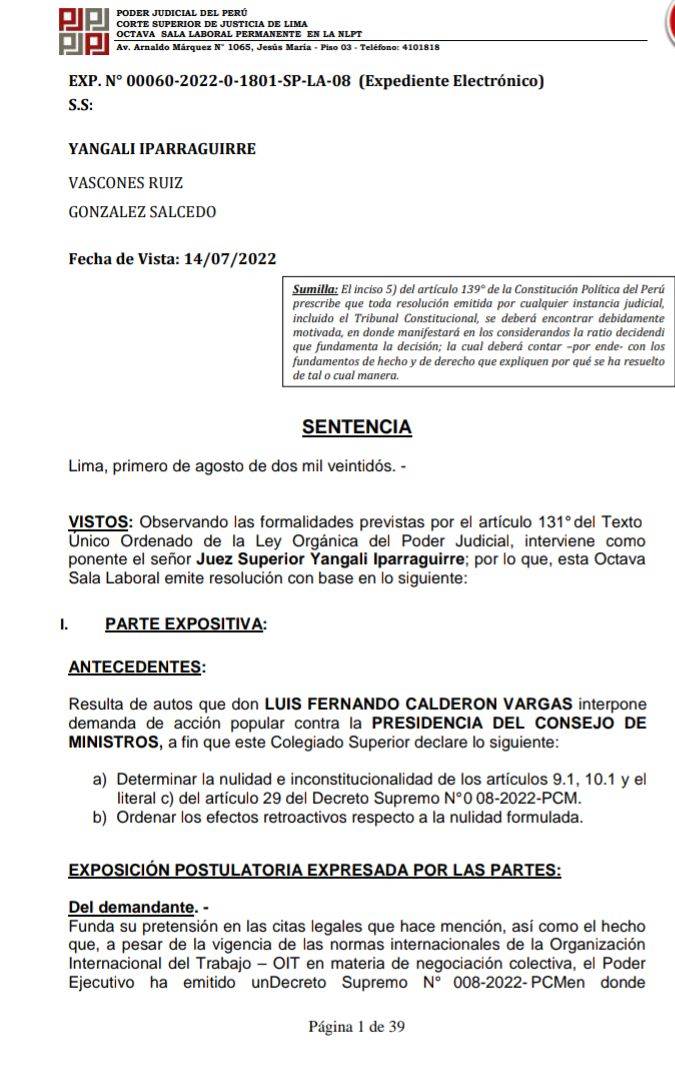 Poder Judicial ordena a PCM a emitir un nuevo reglamento de negociación colectiva a través del cuál se permita que las organizaciones sindicales minoritarios puedan participar de la negociación colectiva descentralizada.